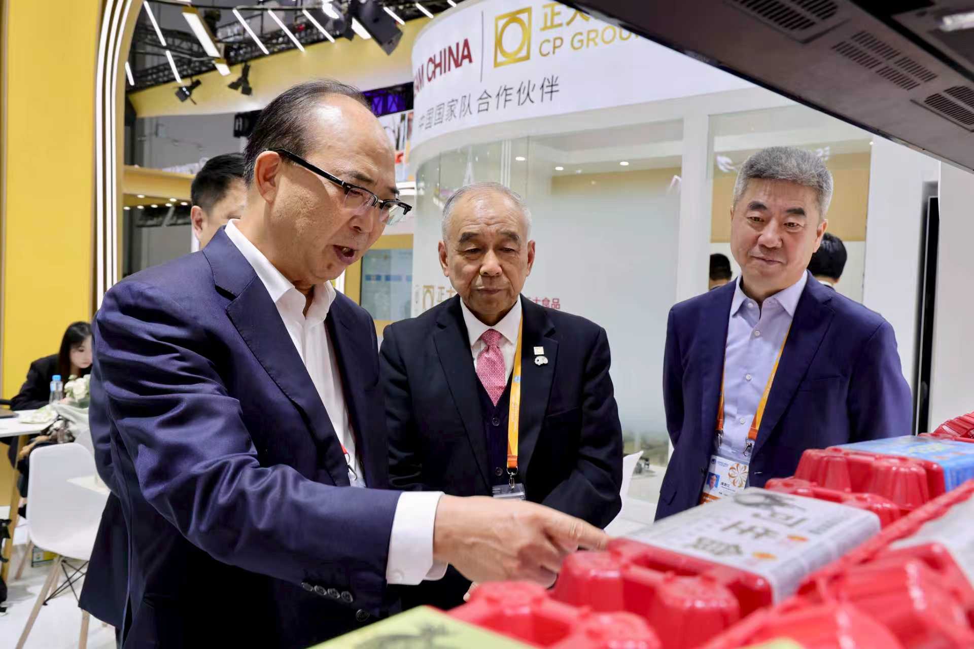 ▲11月5日,益海嘉里金龍魚糧油食品股份有限公司總裁穆彥魁(左一)一行參觀正大展館,薛增一資深副董事長(左二)等熱情接待來賓并介紹正大雞蛋產(chǎn)品。
