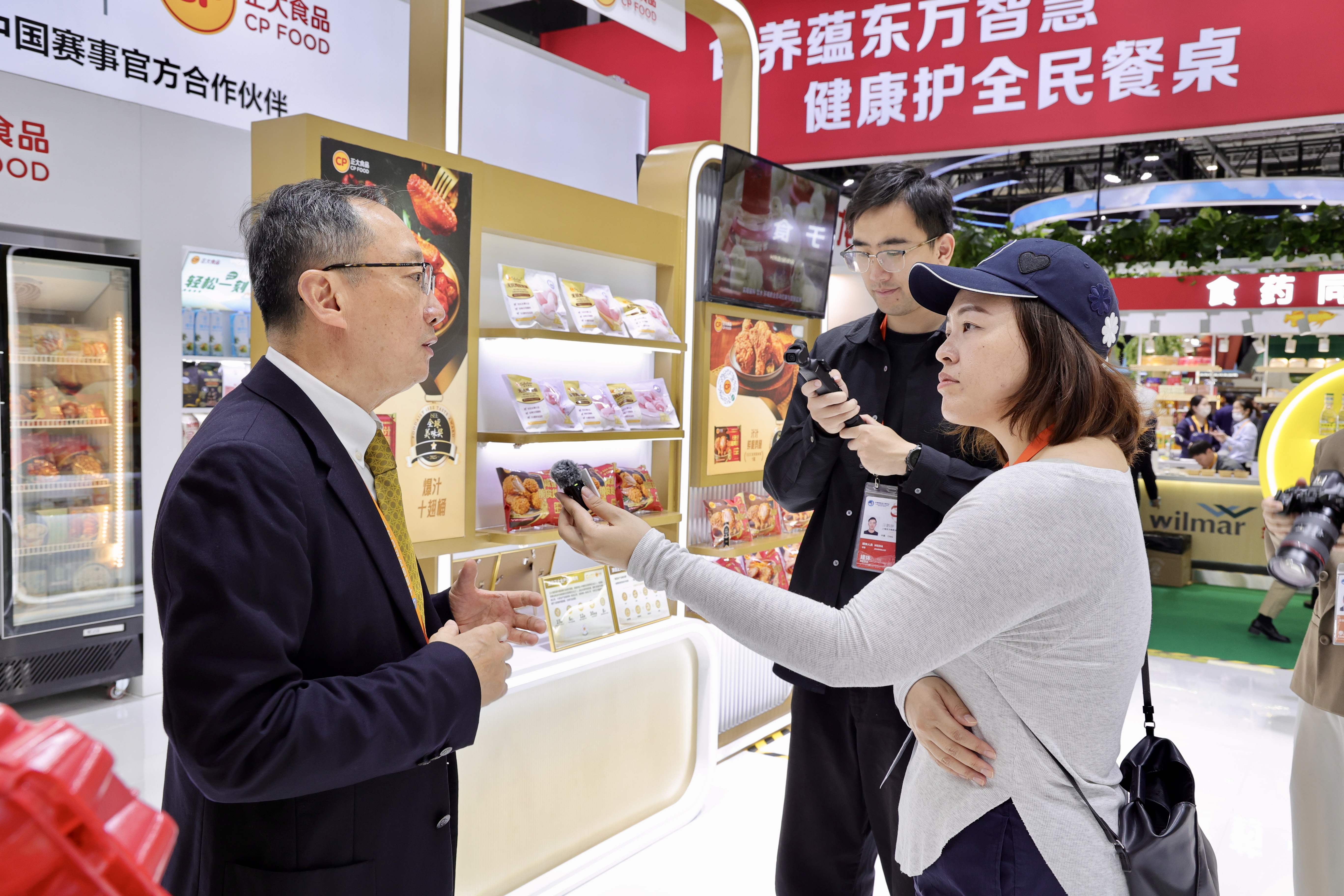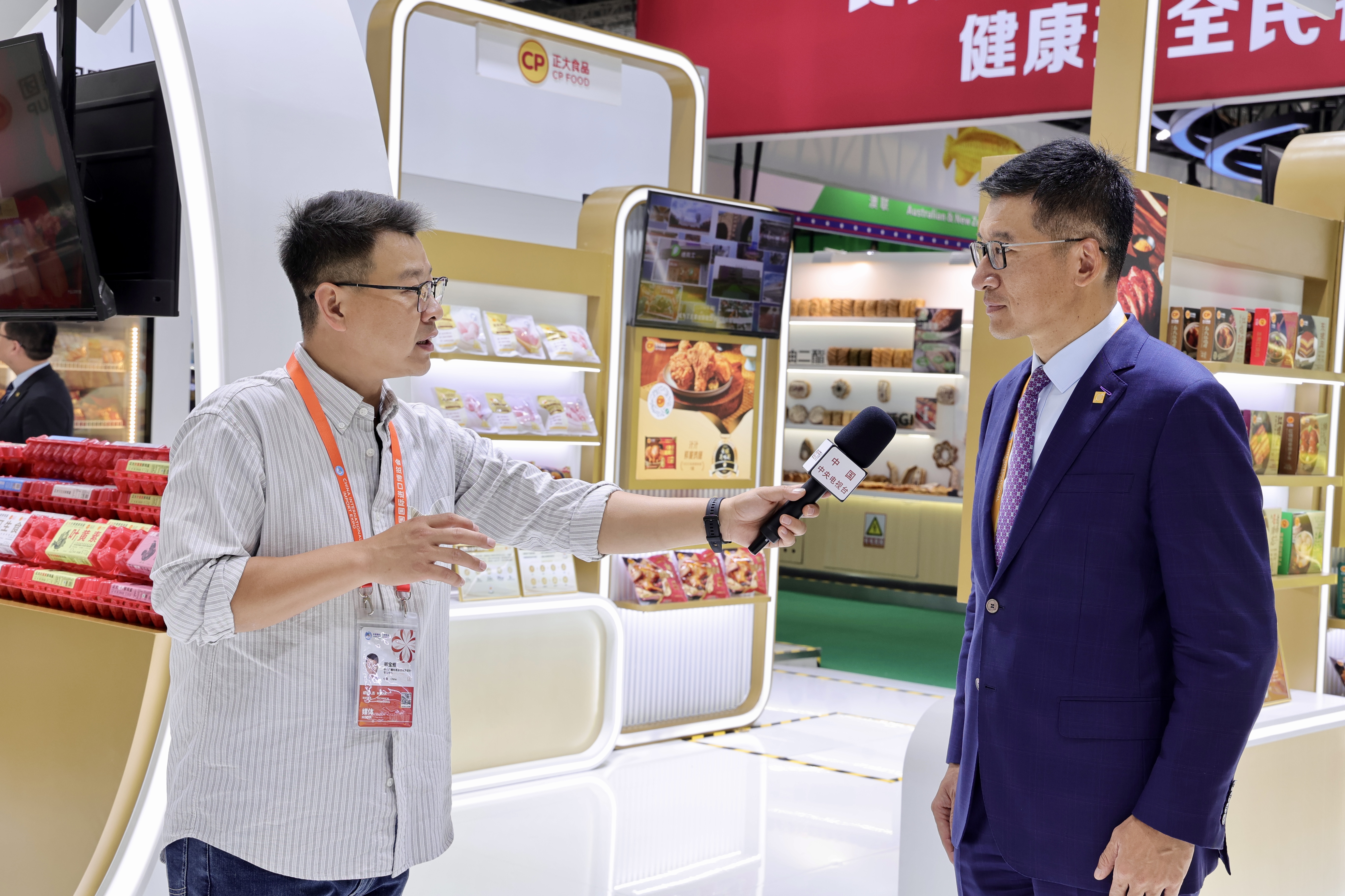 ▲11月5日,揚(yáng)綱副董事長(右)在正大展館接受央視總臺(tái)記者采訪。