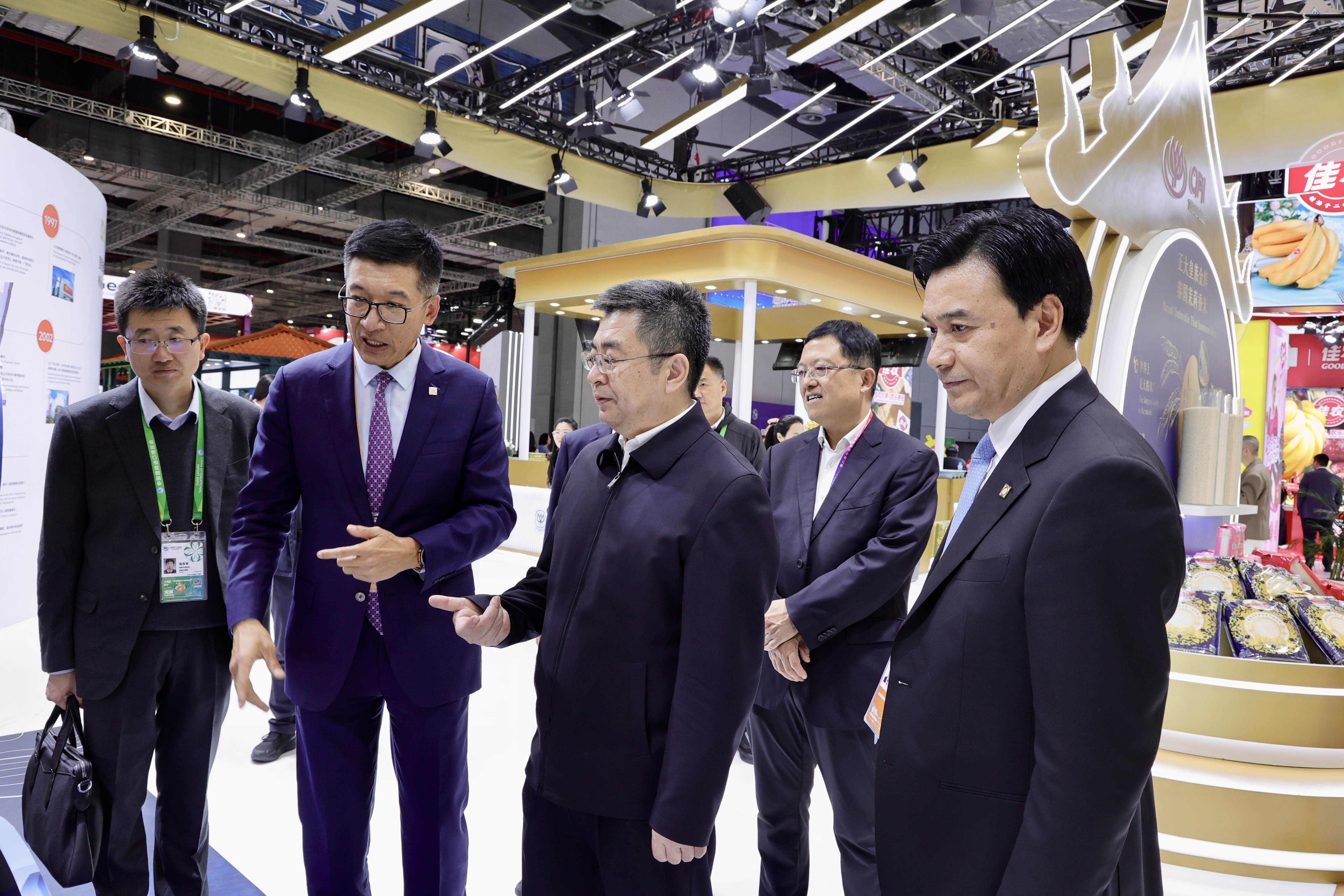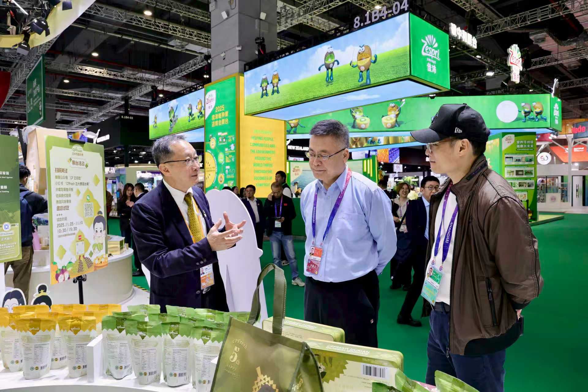 ▲11月5日,中央廣播電視總臺(tái)農(nóng)業(yè)農(nóng)村節(jié)目中心副主任王世林(中)一行參觀正大展館,張曙暉資深總裁(左)熱情接待來賓并介紹CP Fresh泰國水果產(chǎn)品。