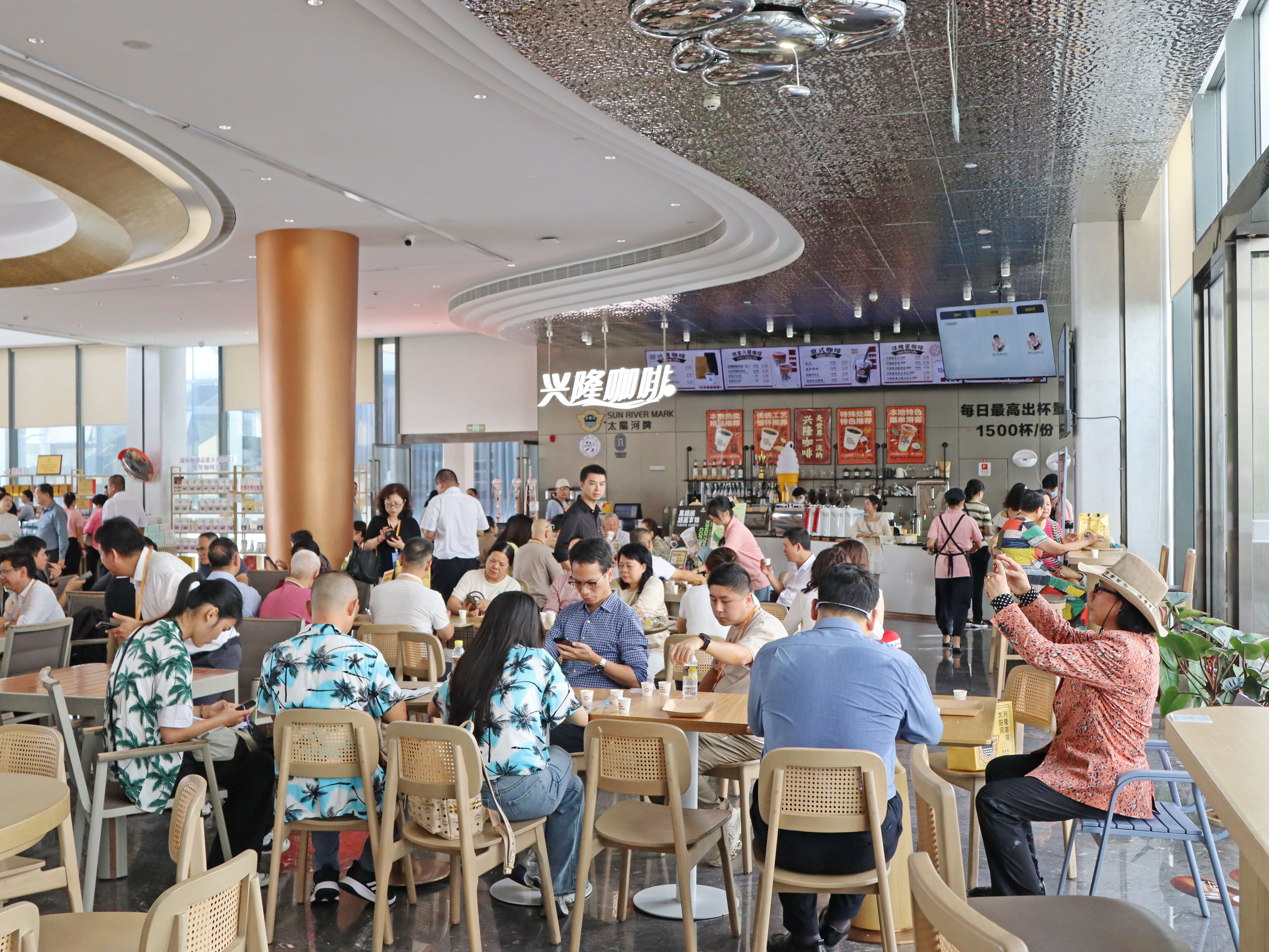 ▲代表團(tuán)一行在正大?興隆咖啡文化園品鑒興隆炭燒咖啡。