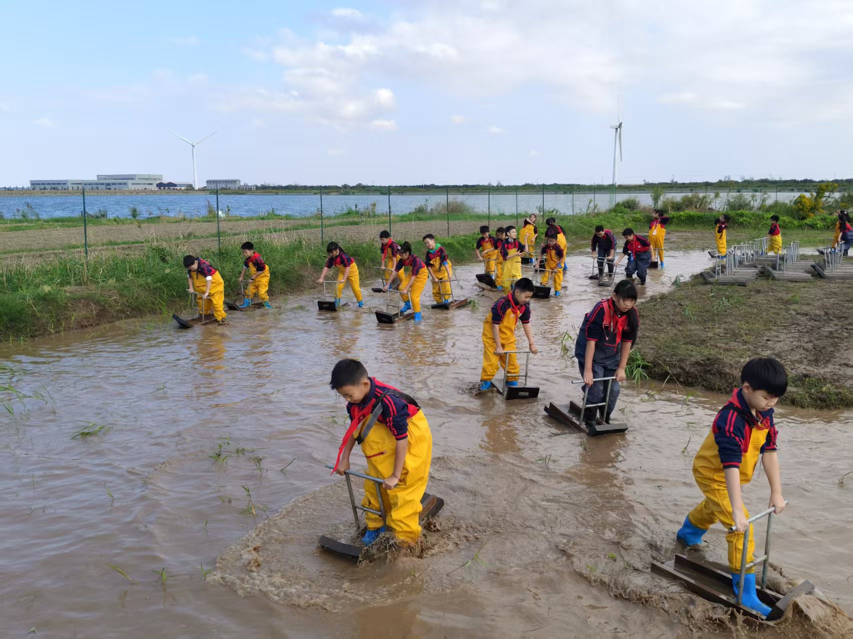 除了食品科學探索,學生們還以“灘涂小司機”的身份,沉浸式體驗慈溪特色灘涂農耕民俗。學生們騎上泥馬船在灘涂滑行,在魚塘里捕魚,尋覓秋日收獲,在歡聲笑語中感受圍墾農耕的辛勞與快樂,也加深了對本土文化的認識。